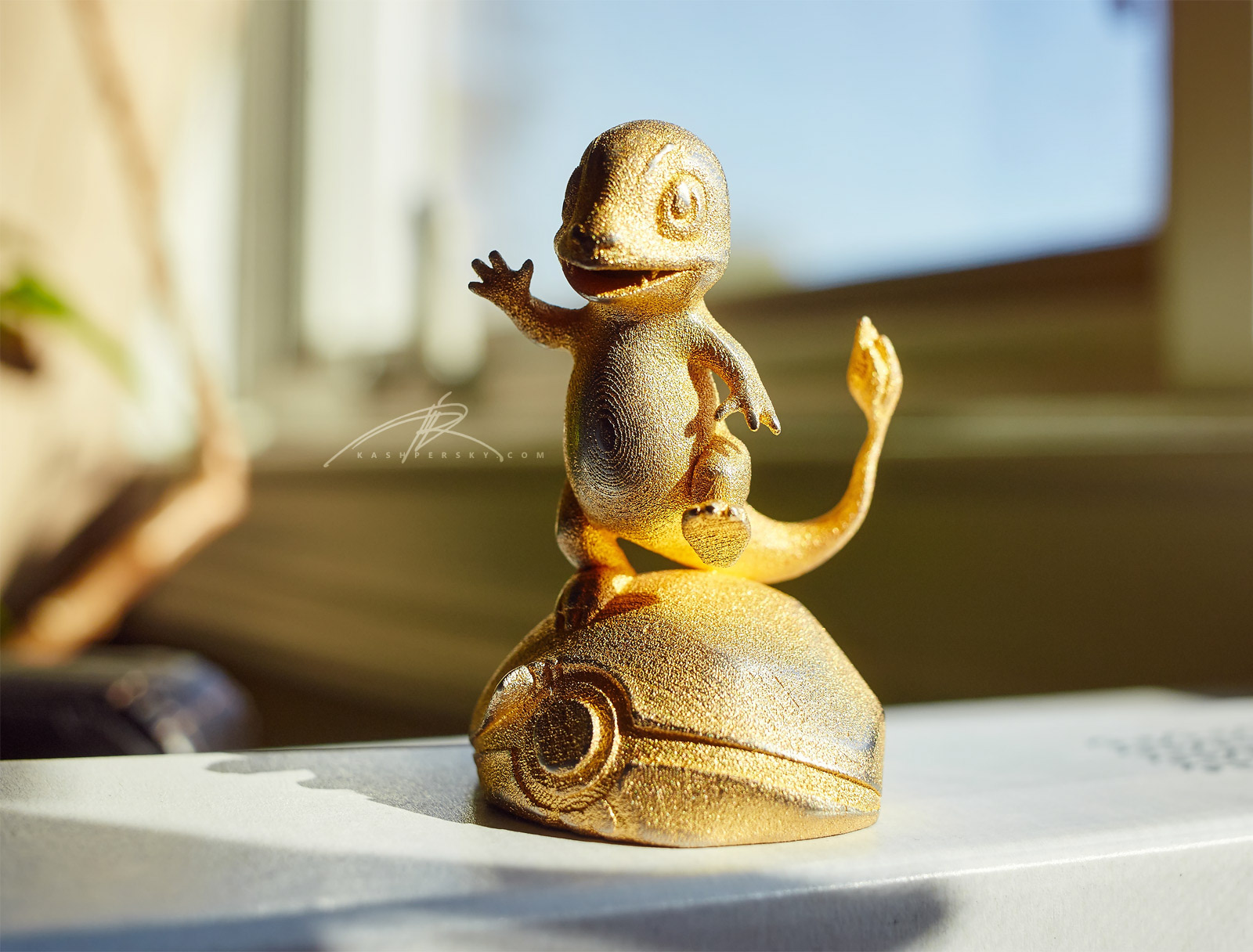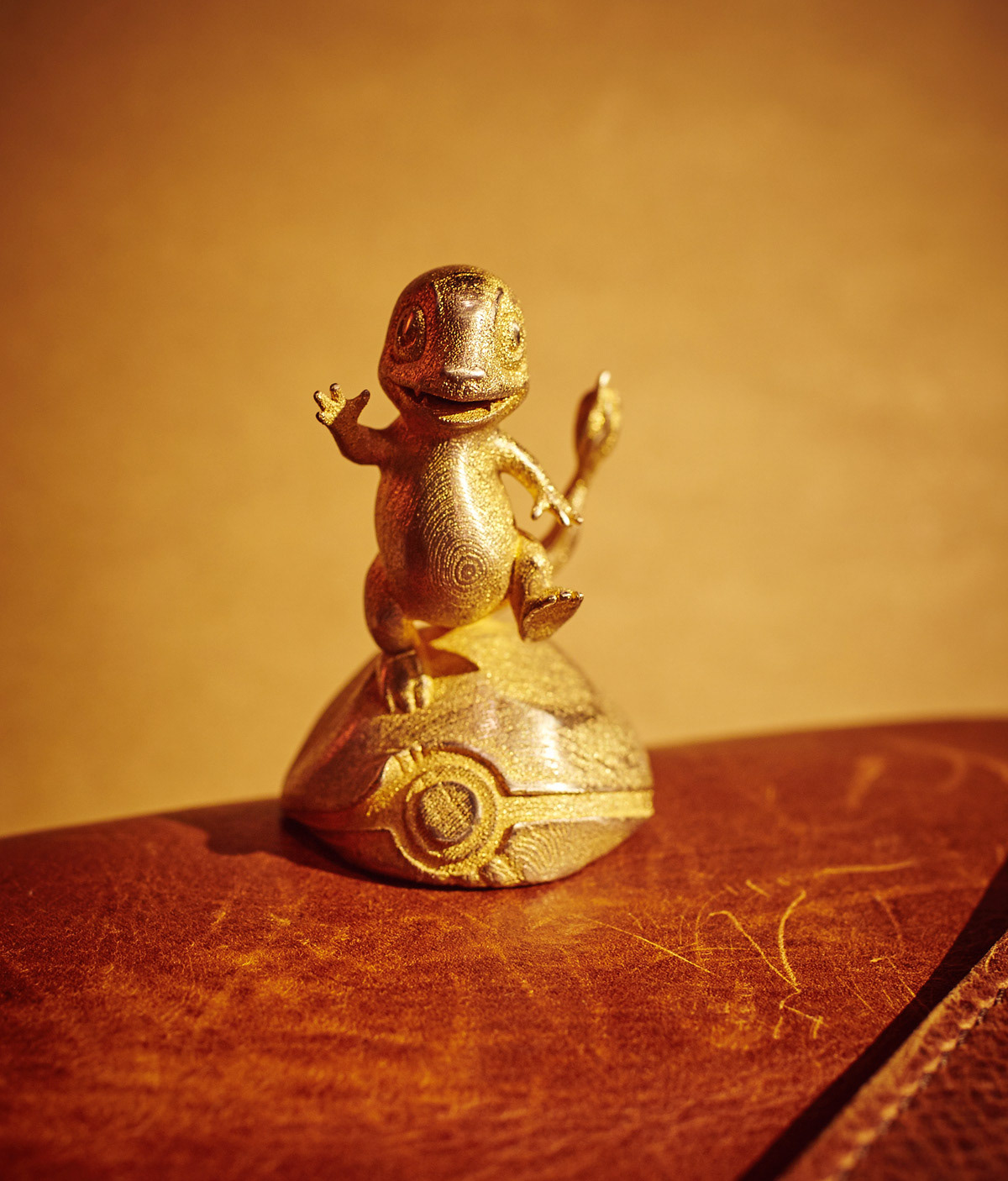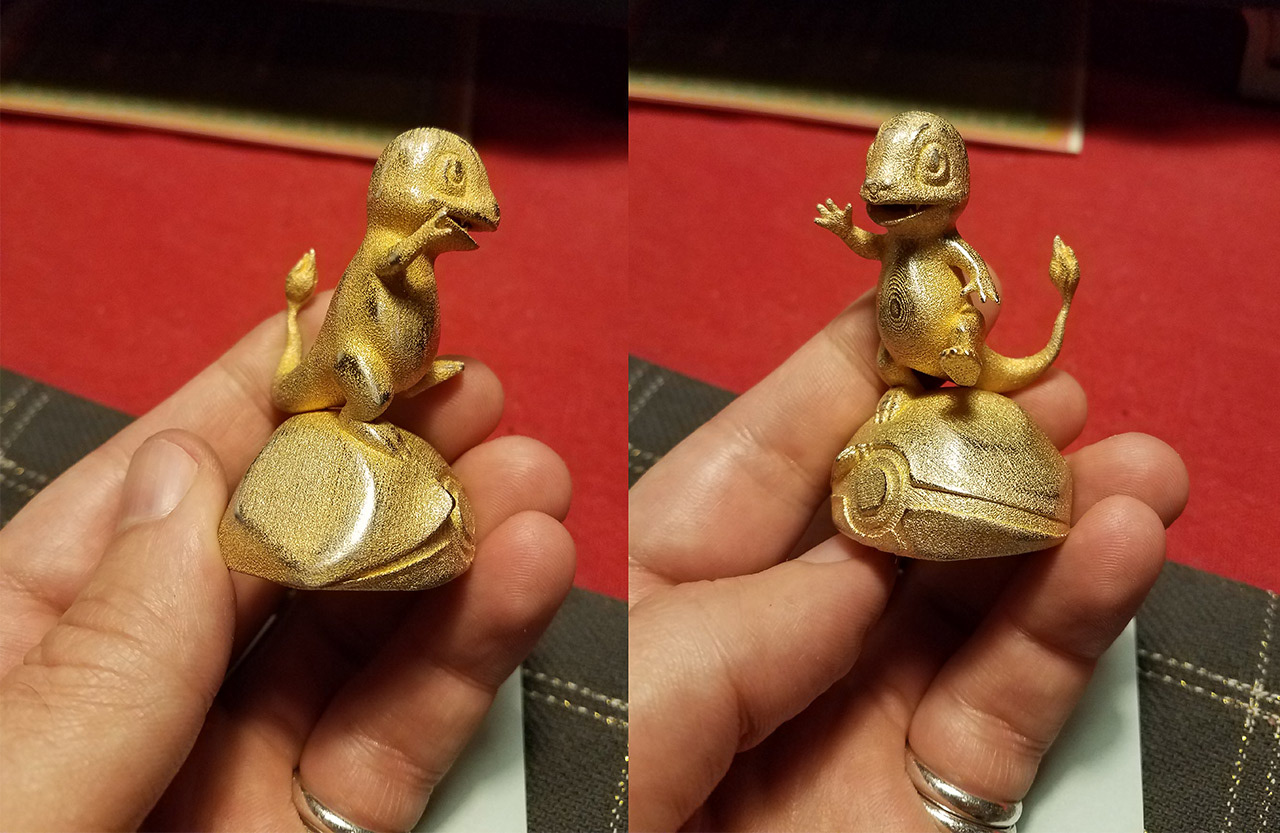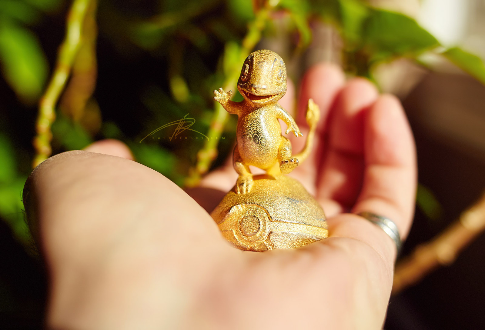 Charmander Sculpture from the original Pokemon series. - Modeled with LOVE - 3D printed in Gold Steel - 6 cm height (2.3 inch) - Hand-sanded