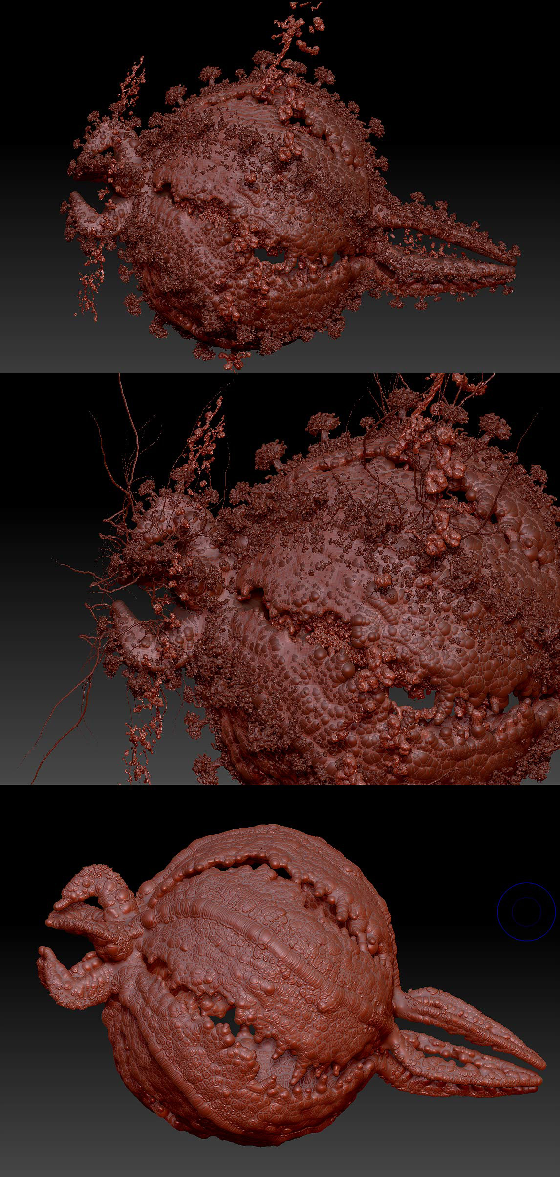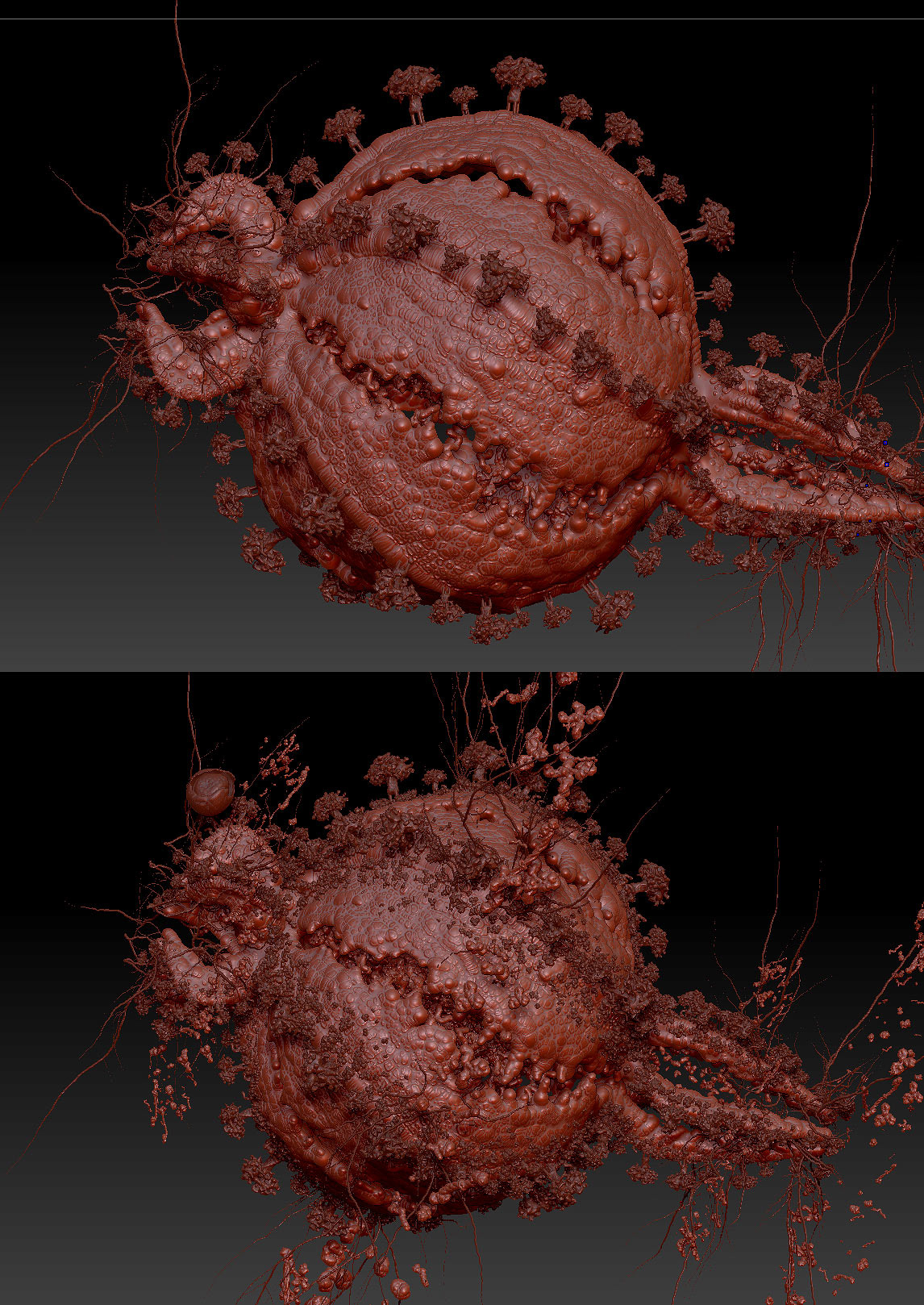 Next, I added small details. It might sound funny but I got the hairs on the Ebola body using the 3ds Max plugin IvyGen. Spending some time discovering the settings, I found the exact hair shape I needed. Then, I placed these hair bundles all over the body by hand, which took a fair amount of time. Also, I added small details using an Edgeloop. I learned this from my friend who worked on the Prometheus movie concepts. If you are interested in how it works, Google “Panel loops ZBrush”.