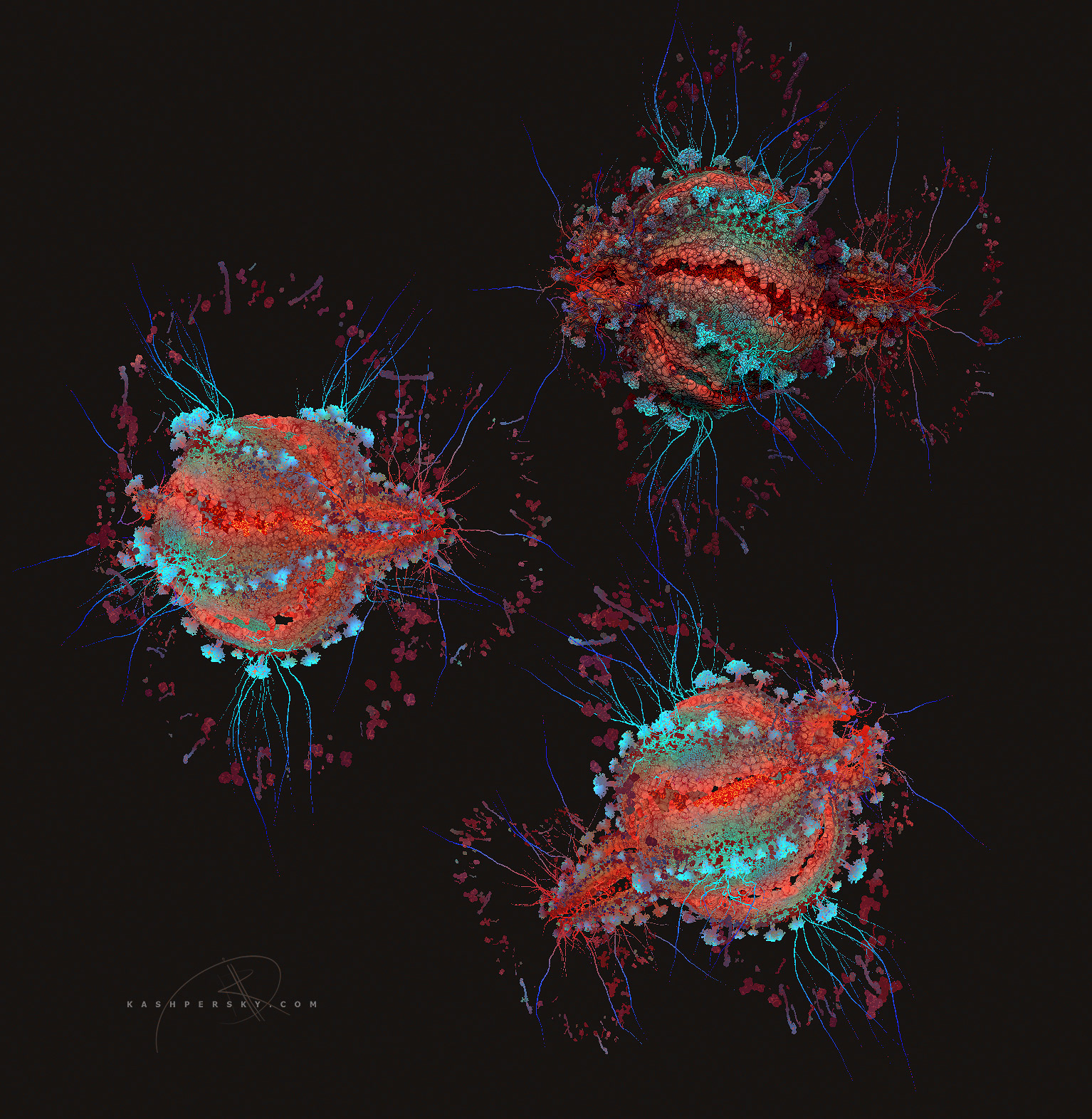 For this “Ebola Virus” Artwork, the R&D project that I did in Radius Digital Science, I used ZBrush for modelling and texturing, 3ds Max for setting up the scene, V-Ray for rendering and Photoshop with After Effects for the post-production process.