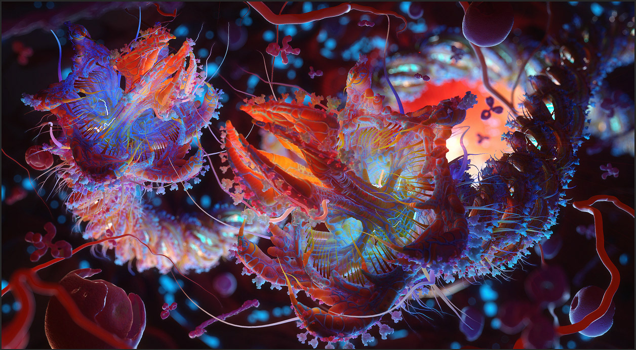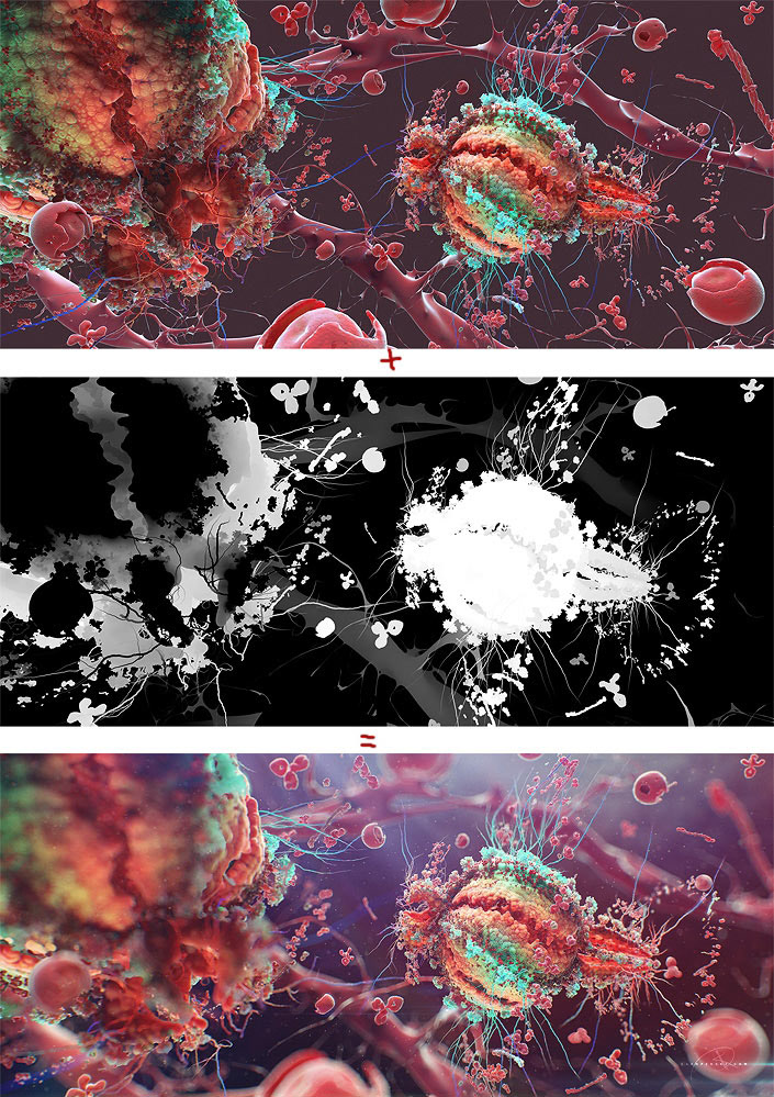 Body object and CellPACK elements detailed and textured in ZBrush 4, using decimation master to optimize the mesh and UV master for unwarping.