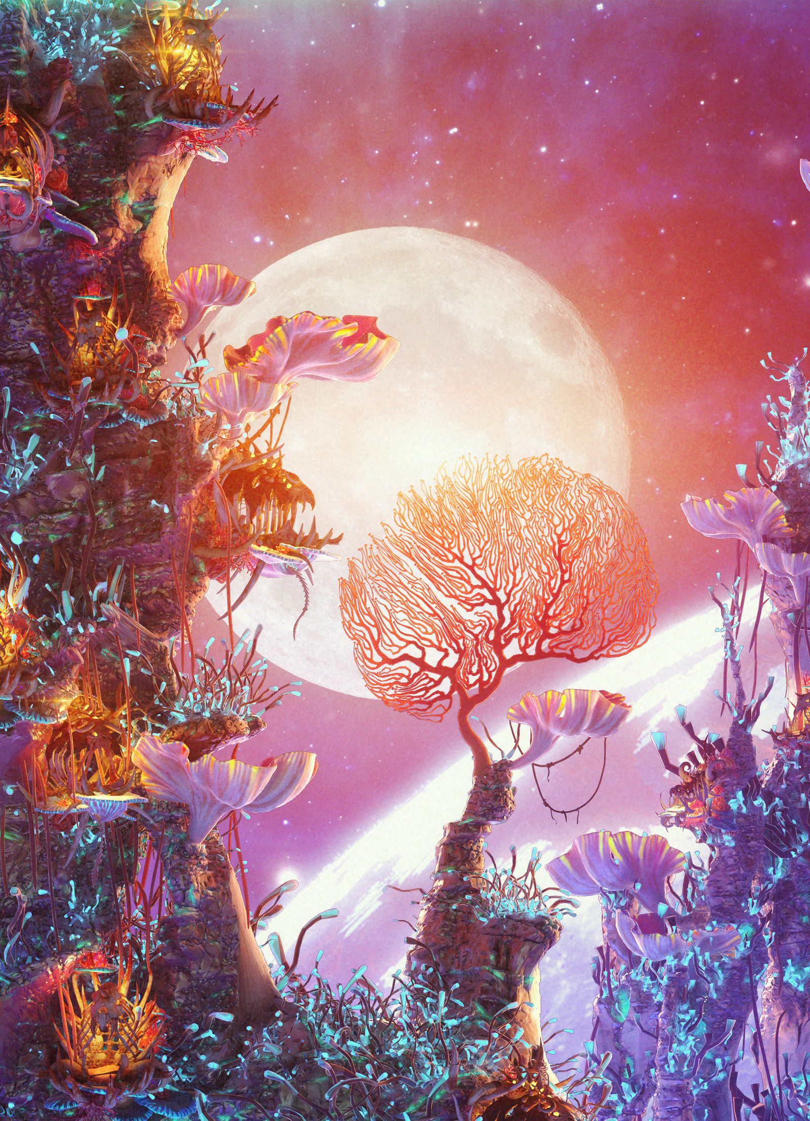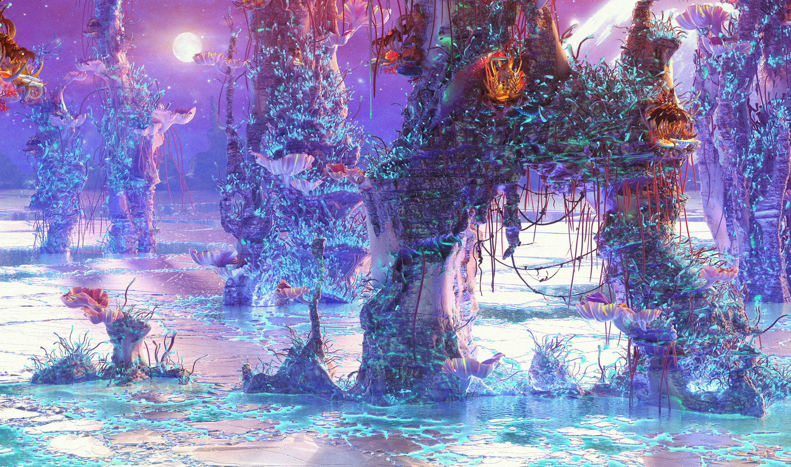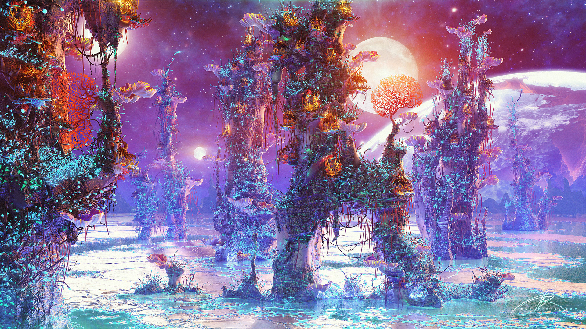 I'm very excited to show you guys some interesting project - concept design for an upcoming movie, that I was working on past year. It was under the NDA for a long time, but finally I'm allowed to show some images :) All models here done in ZBrush. VRay used as render, everything comped in After Effects. Special words of gratitude about Andrey Gritsuk who designed the houses-nests for this location, Alexey Kondakov - father of the broken moon that you can see over the horizon, and also my wife Elena Kashpersky. All the Floral elements and Ice models are her creations. You all guys helped me so much and did really amazing job!