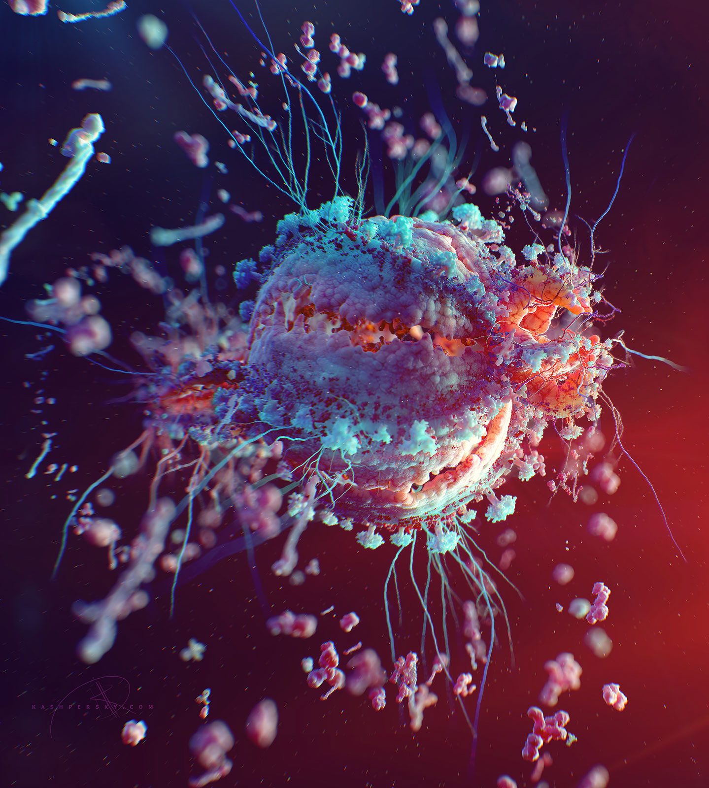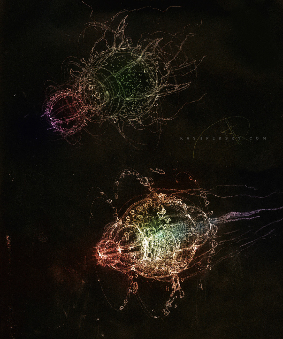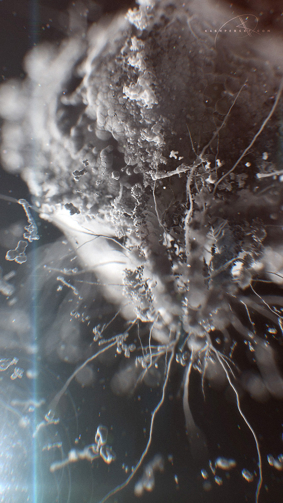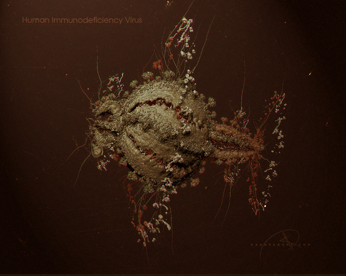 Many days I tried to find a composition solution, playing with the model. All attempts were not interesting and I decided to go with the other side. I decided that it is necessary to try to express the nature of the HIV not only in colour or render, but also in the form. I started drawing, began searching the spirit of HIV on the paper. After I found the shape on the paper I have made it in Z-Brush. All small elements exept the "body" was taken from the HIV Model generated with CellPACK.