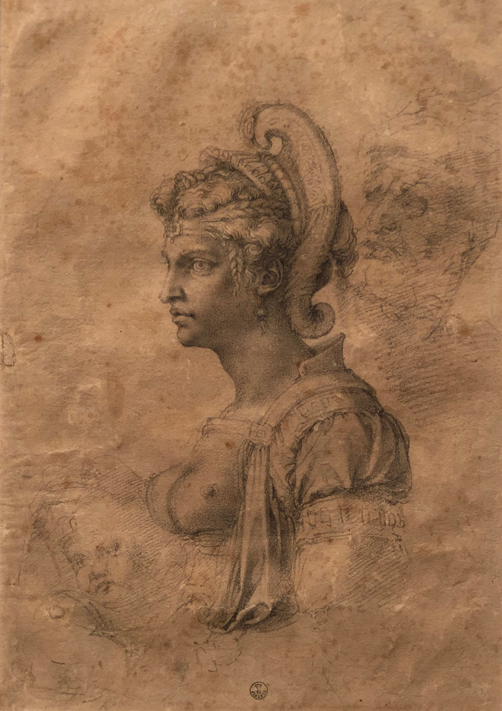 Michelangelo’s love for the handsome, aristocratic young men he befriended was an open secret among his contemporaries. He produced beautifully finished drawings (disegni finiti) of bust-length figures for intimate friends, which Giorgio Vasari called teste divine, or “divine headsin his 1568 biography. Apart from the drawing technique, the most striking aspect of these representations is the highly decorative detail on the figures’ headdresses and costumes. Though they are largely the artist’s invention, these fantastical passages were inspired in part by antique gems and paintings.