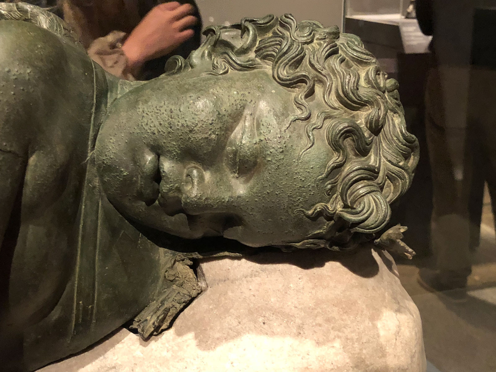 Michelangelo’s marble Young Archer, carved in the late 1490s, is the focal point of this gallery. His precocious understanding of the figure is wholly personal and innovative, yet the young artist has not fully unified the different parts or synthesized the lessons learned from his predecessors. Works by classical sculptors and Bertoldo here illuminate certain aspects of Michelangelo’s approach to the figure. The tactile surface treatment of the boy’s torso and limbs, evocative of living flesh, is an effect probably learned from Roman and Hellenistic sculptures like the nearby Eros Sleeping. The elegant spiral pose of Michelangelo’s archer may have come to the artist as he studied bronze statuettes by Bertoldo and ancient sculptors.